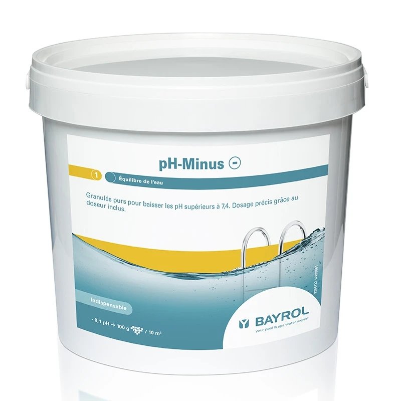 La rĂ©gulation du pH est la clĂ© du traitement de l’eau de votre piscine. Un pH mal ajustĂ© risque de rendre inefficaces les produits de traitement que vous utilisez dans le bassin et pourrait reprĂ©senter une perte importante de temps et d’argent. Il est donc conseillĂ© de vĂ©rifier votre pH chaque semaine et s’il est trop haut (supĂ©rieur Ă 7,4) il vous faut le baisser Ă l’aide du pH minus de Bayrol.