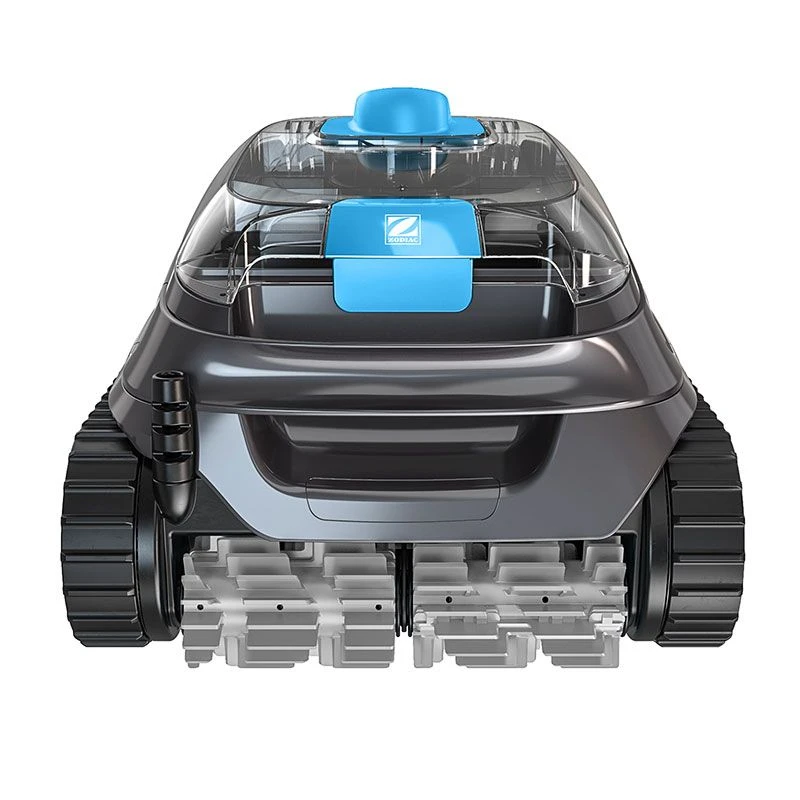 Nettoyage complet du fond jusqu’à la ligne d’eauLa couverture de nettoyage du robot piscine Zodiac CNX25 est totale. Il est en mesure de se déplacer sur l’ensemble du bassin et vous offre le choix entre deux cycles de nettoyage : fond seul ou fond, parois et ligne d’eau.. C’est un robot agile qui dispose d’une traction double moteur pour une aisance maximale dans ses déplacements. Sur son passage, les brosses en forme d’hélice vont décoller les saletés et améliorer la collecte des débris fins et légers. Le savoir-faire Zodiac vous facilitera sensiblement le nettoyage quotidien de la piscine. | | Couvercle transparent et maintenance facilePour vous simplifier la vie, le filtre est accessible par le dessus du robot et se nettoie très facilement, en vous évitant le contact avec les débris. Vous souhaitez savoir si le nettoyage du filtre est nécessaire ? Rien de plus simple, le robot piscine Zodiac CNX25 dispose d’un couvercle transparent grâce auquel vous pourrez contrôler rapidement l’encrassement du filtre sans avoir à manipuler le robot. |